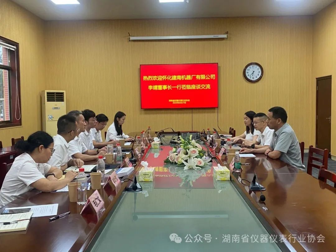 6月27日下午,怀化建南机器厂有限公司董事长李靖率核心团队一行七人莅临湖南省仪器仪表行业协会座谈交流。协会轮值理事长文胜、秘书长徐振轩、专职副秘书长彭秀云等代表协会热情接待,双方就行业发展趋势、协会服务模式和企业具体需求进行了座谈交流。