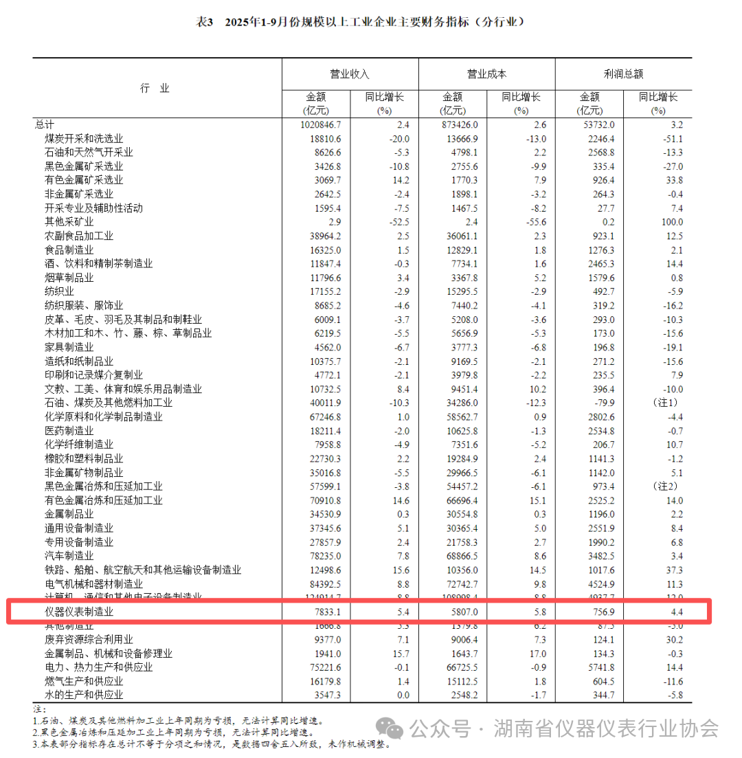 10月27日,国家统计局公布了2025年1-9月份全国规模以上工业企业实现利润总额增长状况。1—9月份,全国规模以上工业企业实现利润总额53732.0亿元,同比增长3.2%。其中,1-9月份全国规模以上仪器仪表制造企业实现利润总额756.9亿元,同比增长4.4%。