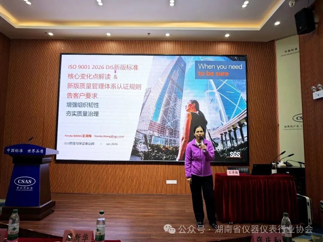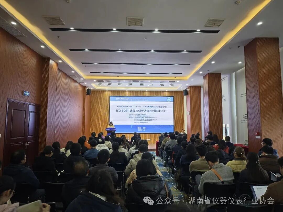 为深入贯彻落实国家“十五五”高质量发展战略,推动制造业质量升级,1月9日下午,由长沙市质量和标准化协会主办,SGS通标标准技术服务有限公司承办,湖南省仪器仪表行业协会等多家单位协办的“质量强市·产业升级”——ISO 9001转版与新版认证规则解读培训在长沙成功举办。湖南省仪器仪表行业协会作为协办单位之一,积极组织近20余位会员单位代表参与本次专题培训,共同学习新版质量管理体系标准,把握行业认证新动态。