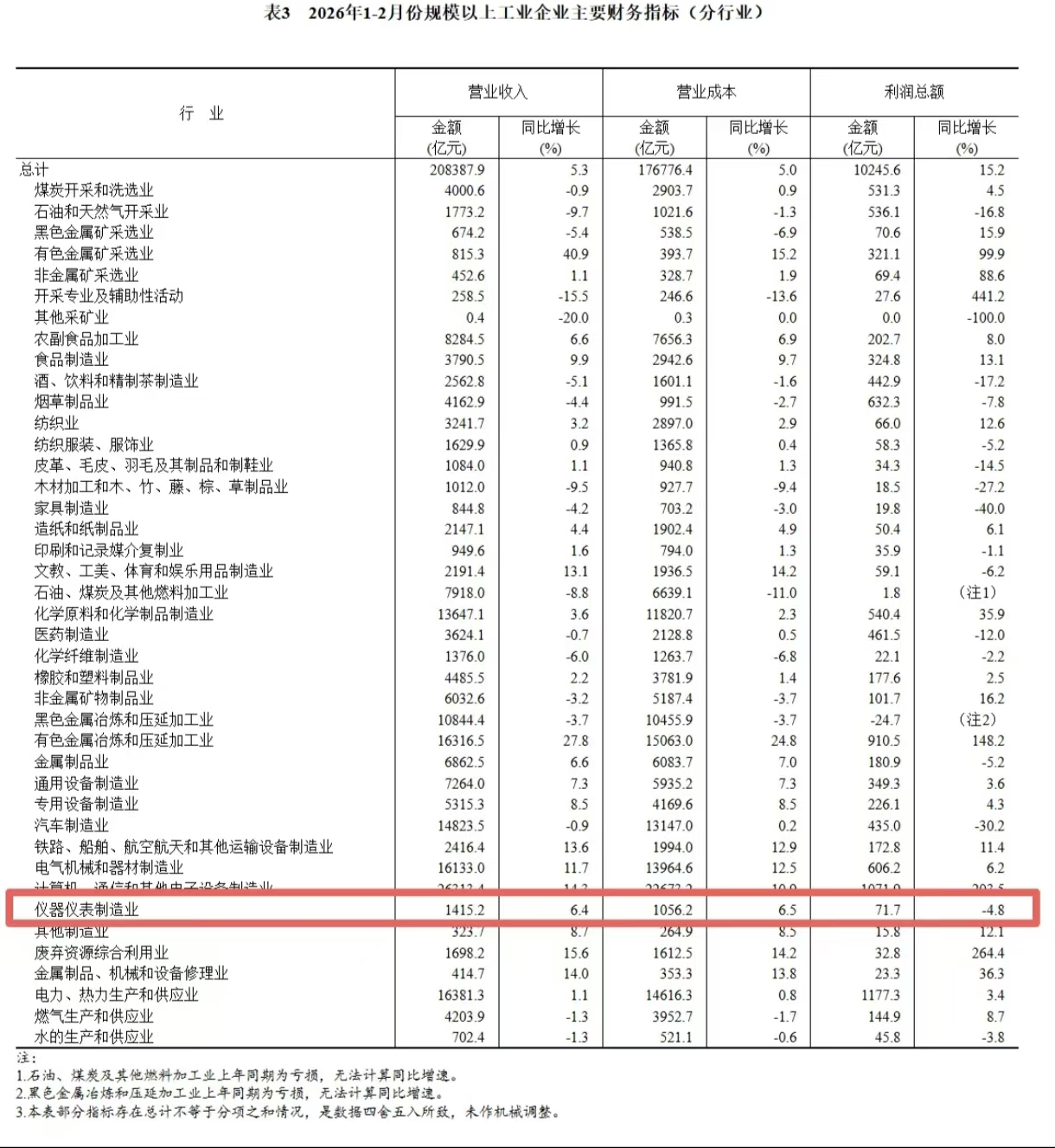 3月27日,国家统计局公布了2026年1-2月份全国规模以上工业企业实现利润总额增长状况。1-2月份,全国规模以上工业企业实现利润总额10245.6亿元,同比增长15.2%。其中,1-2月份全国规模以上仪器仪表制造企业实现营收1415.2亿元,同比增长6.4%,实现利润总额71.7亿元,同比下降4.8%。